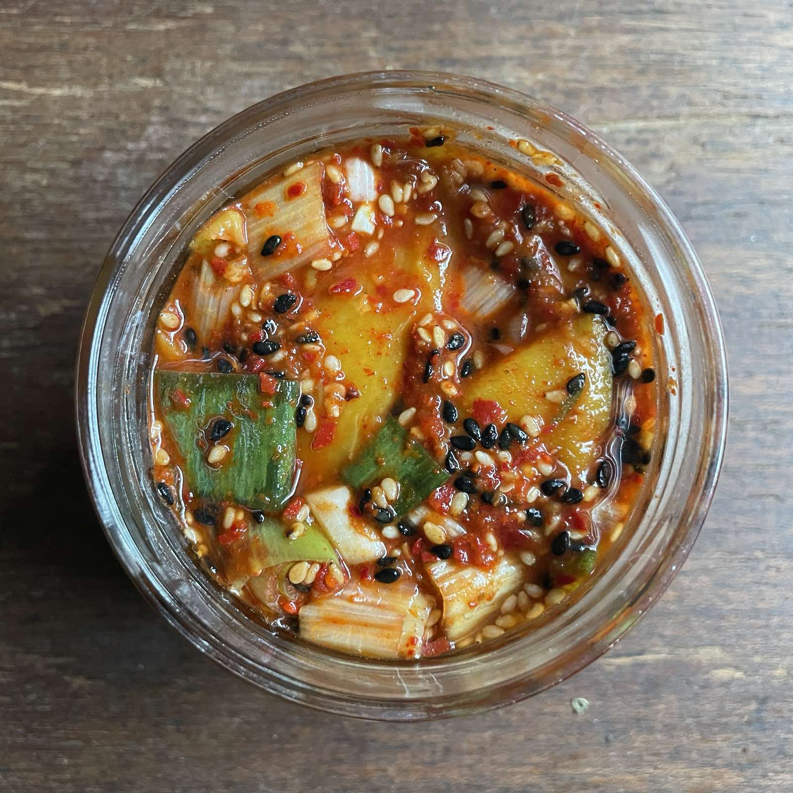 seasonal organic veg, rice flour, water, gochugaru, muscovado, garlic, organic ginger, soy sauce, sesame oil, sesame seeds, sea salt